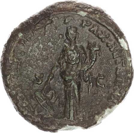 | 225. | Sestercius, stoj.Pietas zprava mezi S C s paténou, obětuje u oltá