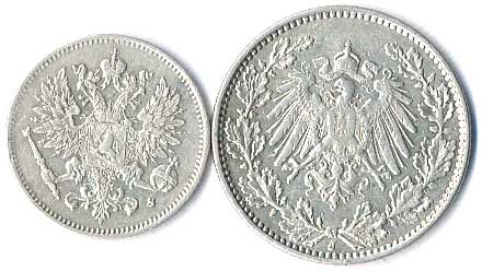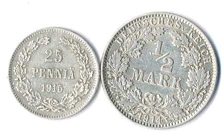 | 818. | 25 Penniä 1915, 1/2 Mark 1914 J, 2ks | 1-1- | 120,- | --.- |