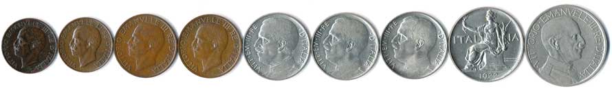 | 841. | 5,5,10,10,50,50 Centesimi, 1919,31,22,23,19,20,25, 1 a 2 Lire, 1922,24, 9ks | 0-1 | 180,- | --.- |