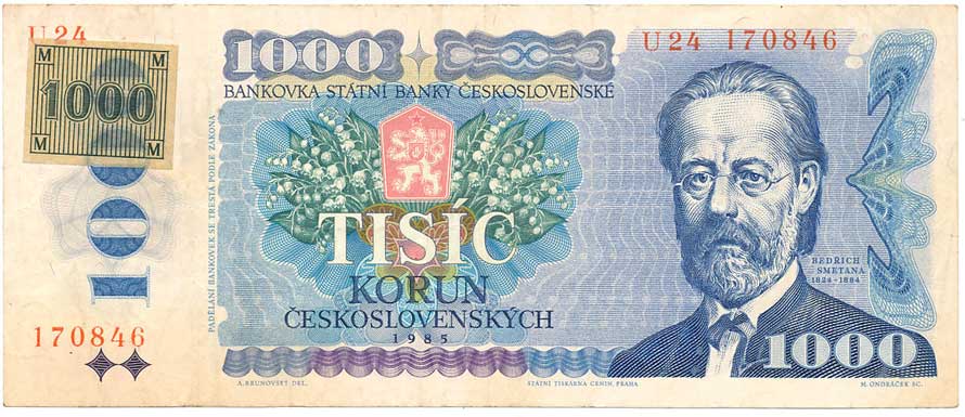 | 2105. | 1000 Kčs 1985 s.U24, lepený kolek | 2- | 2400,- | --.- |